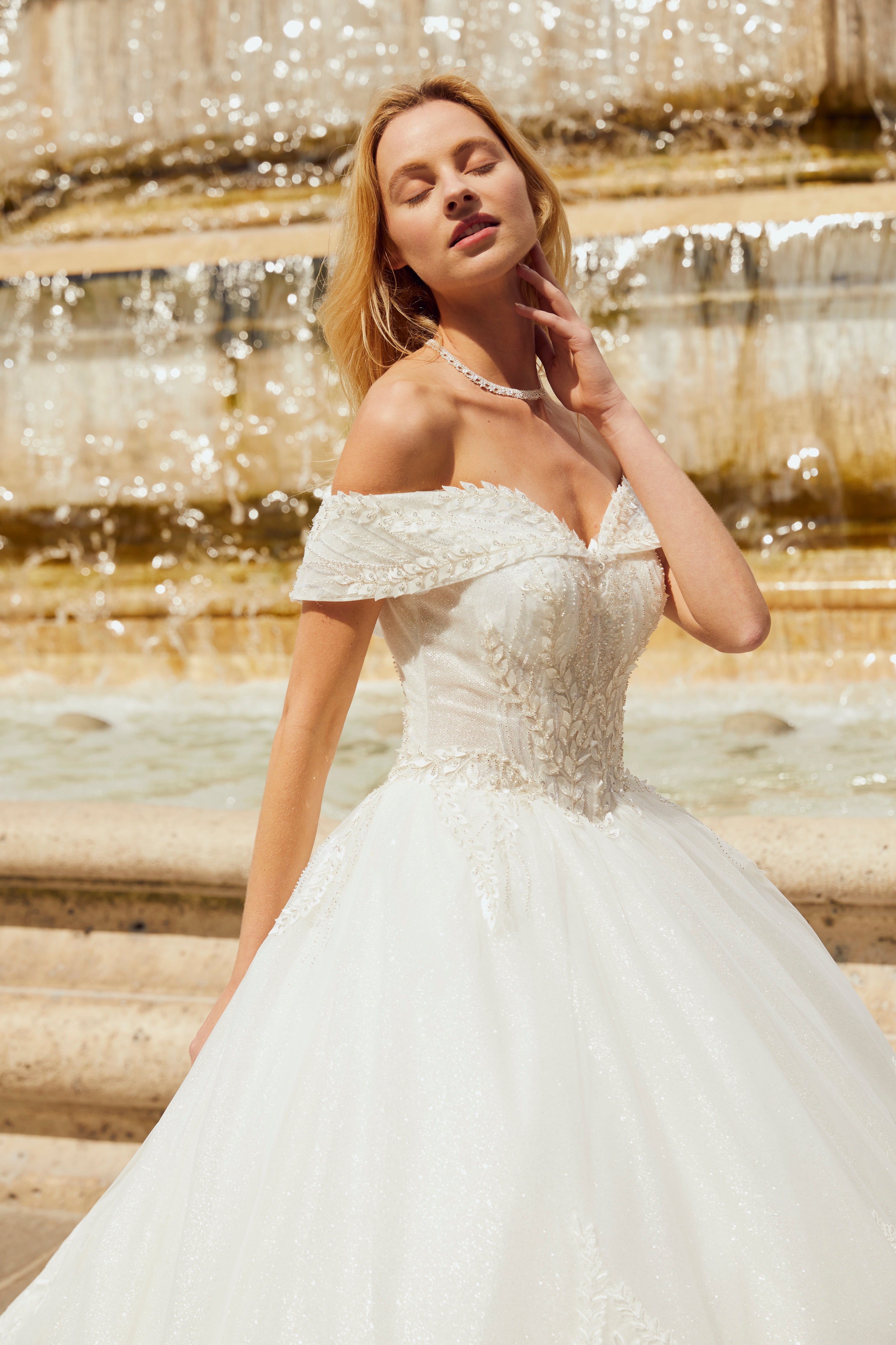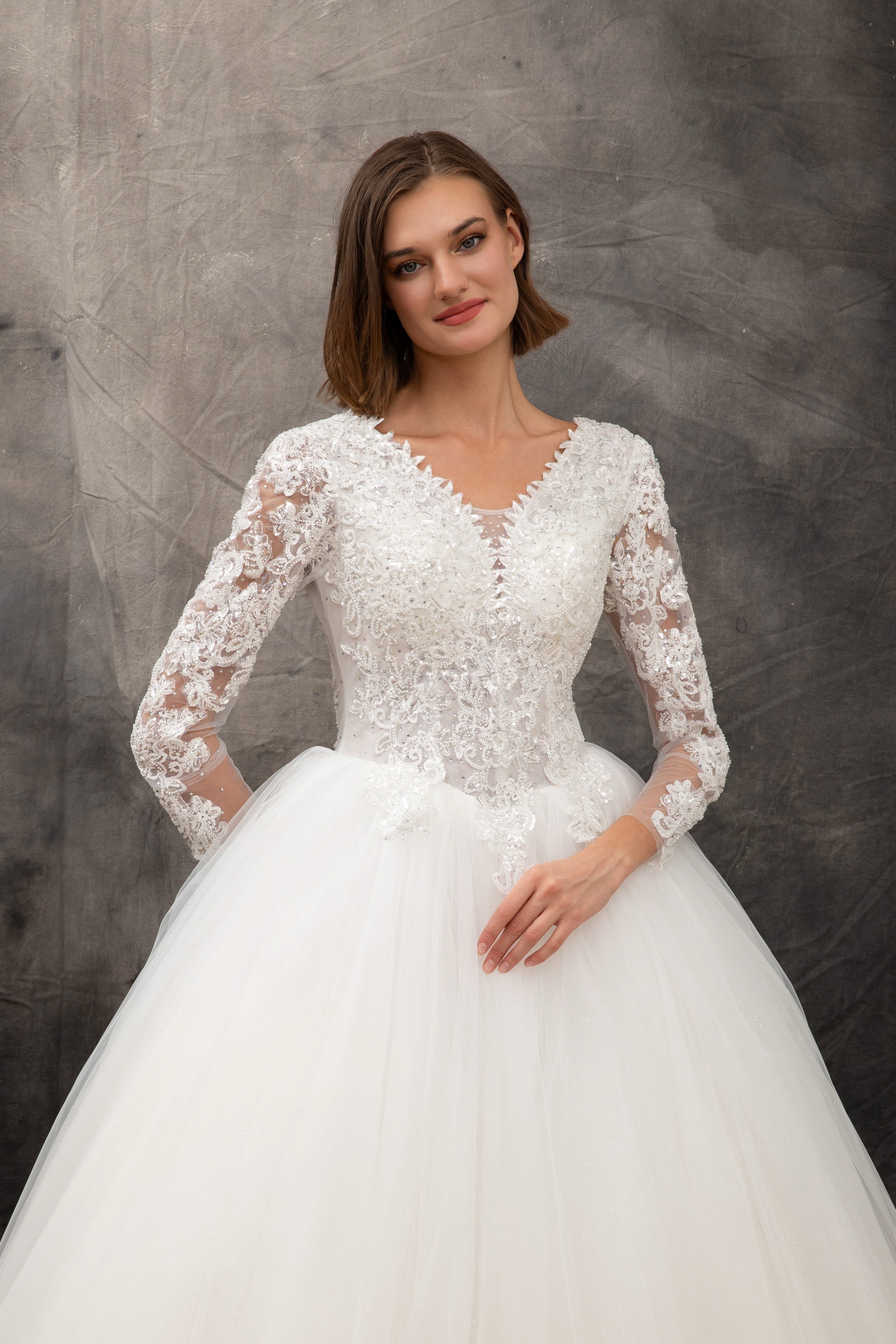 Une robe de mariée princesse, brillante et majestueuse, sublimée par une longue manche élégante. Un modèle éclatant qui offre une allure royale, chic et infiniment glamour.